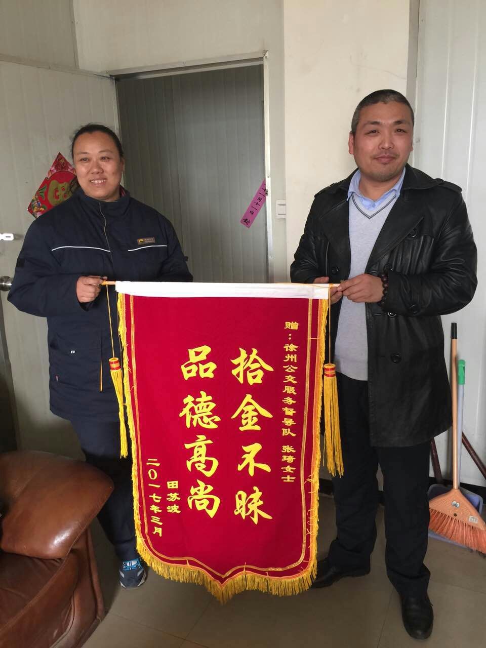 3月29日,正在站臺(tái)執(zhí)勤的督導(dǎo)員張琦撿到乘客掉落的公文包,經(jīng)查看發(fā)現(xiàn)包內(nèi)有蘋果筆記本一臺(tái)和一個(gè)錢包,但并沒有找到皮包主人的聯(lián)系方式。張琦把包放在了調(diào)度室等待失主來認(rèn)領(lǐng),約一小時(shí)后失主匆忙趕來尋找。失主見到失而復(fù)得的皮包非常激動(dòng),經(jīng)過詢問得知失主姓田在徐州礦業(yè)大學(xué)工作。田先生說,“電腦里存有非常重要的資料和聯(lián)系方式,丟包之后萬分焦急,真心感謝公交督導(dǎo)員?!彪S即從錢包里拿出400元錢塞給張琦作為答謝,張琦表示:“路不拾遺本就是自己的義務(wù),作為站臺(tái)督導(dǎo)員經(jīng)常會(huì)在站臺(tái)撿到乘客掉落的物品,不管東西貴重與否我們都會(huì)幫失主妥善保管等待認(rèn)領(lǐng)?!?/span>3月31日,田先生和他的愛人送來錦旗表示感謝!
